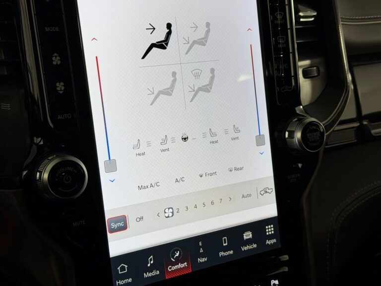 Inside, the Ram 2500 Power Wagon offers a comfortable and functional cabin designed for both work and daily driving. The truck features modern technology including the Uconnect® infotainment system with touchscreen display, Apple CarPlay®, Android Auto™, Bluetooth connectivity, and available navigation. The spacious interior provides seating for multiple passengers along with plenty of storage and premium materials for long trips or tough job sites.
